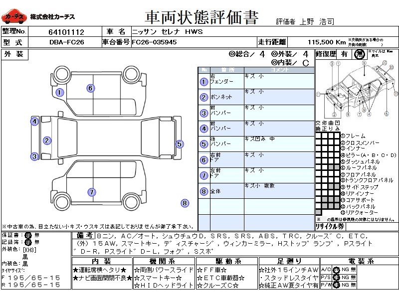乗車定員(8人) / エアコン(オート) / パワーステアリング / パワーウィンドウ / 集中ドアロック / エアバッグ / 助手席エアバッグ / ABS / トラクションコントロール / クルーズコントロール / ETC / アルミホイール(社外)(15インチ) / スマートキー / ディスチャージ / ウインカーミラー / ハイマウントストップランプ / パワースライドドア / フォグランプ / サイドスポイラー /