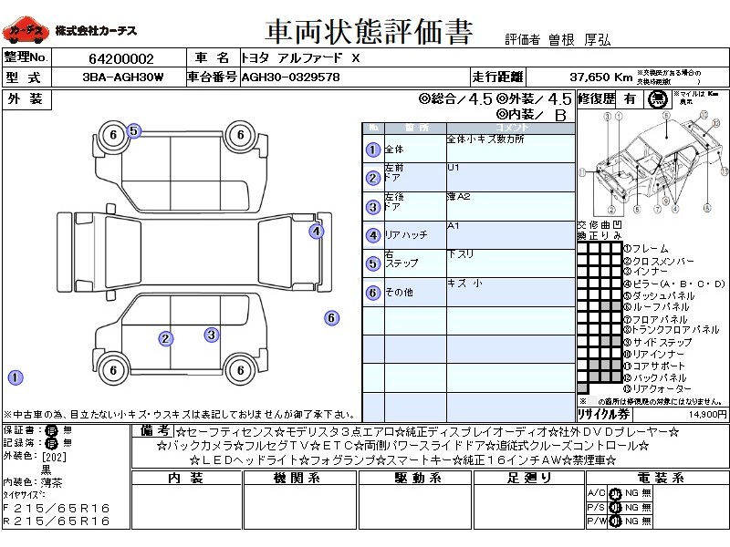 乗車定員(8人) / エアコン(オート) / パワーステアリング / パワーウィンドウ / 集中ドアロック / エアバッグ / 助手席エアバッグ / サイドエアバッグ / ABS / トラクションコントロール / クルーズコントロール / テレビ(アナログ) / 地デジTV / バックカメラ / ETC(社外) / アルミホイール(16インチ) / スマートキー / ウインカーミラー / ハイマウントストップランプ / パワースライドドア / フォグランプ / フロントスポイラー / サイドスポイラー / リアスポイラー / リアアンダースポイラー /