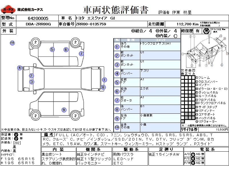 フル装備 / CD / 乗車定員(7人) / 集中ドアロック / エアバッグ / 助手席エアバッグ / サイドエアバッグ / ABS / トラクションコントロール / クルーズコントロール / カーナビゲーション(インダッシュ,SSD,2DIN) / テレビ(アナログ) / 地デジTV / フリップダウンモニタ / バックカメラ / ETC / アルミホイール(15インチ) / 革シート(黒) / スマートキー / ウインカーミラー / ハイマウントストップランプ / パワースライドドア / フォグランプ /
