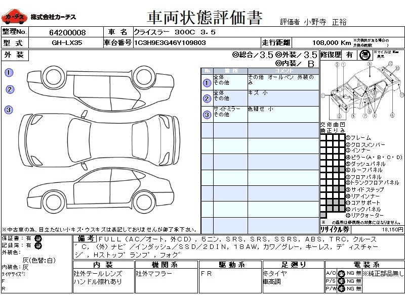 フル装備 / CD(社外) / 乗車定員(5人) / エアバッグ / 助手席エアバッグ / サイドエアバッグ / ABS / トラクションコントロール / クルーズコントロール / カーナビゲーション(社外)(インダッシュ,SSD,2DIN) / 地デジTV(社外) / アルミホイール(18インチ) / 革シート(グレー) / キーレスエントリー / ディスチャージ / ハイマウントストップランプ / フォグランプ / マフラー(社外) / 足回り /