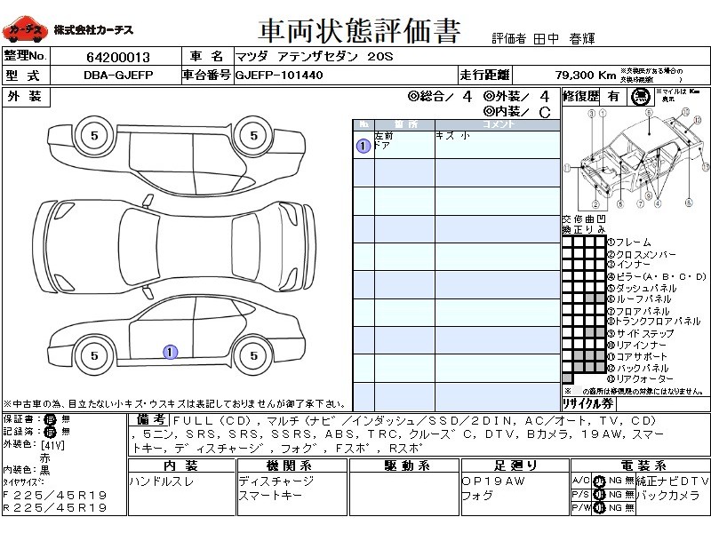 フル装備 / CD / マルチ(ナビ) / エアコン(オート) / テレビ(アナログ) / 乗車定員(5人) / エアバッグ / 助手席エアバッグ / サイドエアバッグ / ABS / トラクションコントロール / クルーズコントロール / 地デジTV / バックカメラ / アルミホイール(19インチ) / スマートキー / ディスチャージ / フォグランプ / フロントスポイラー / リアスポイラー /