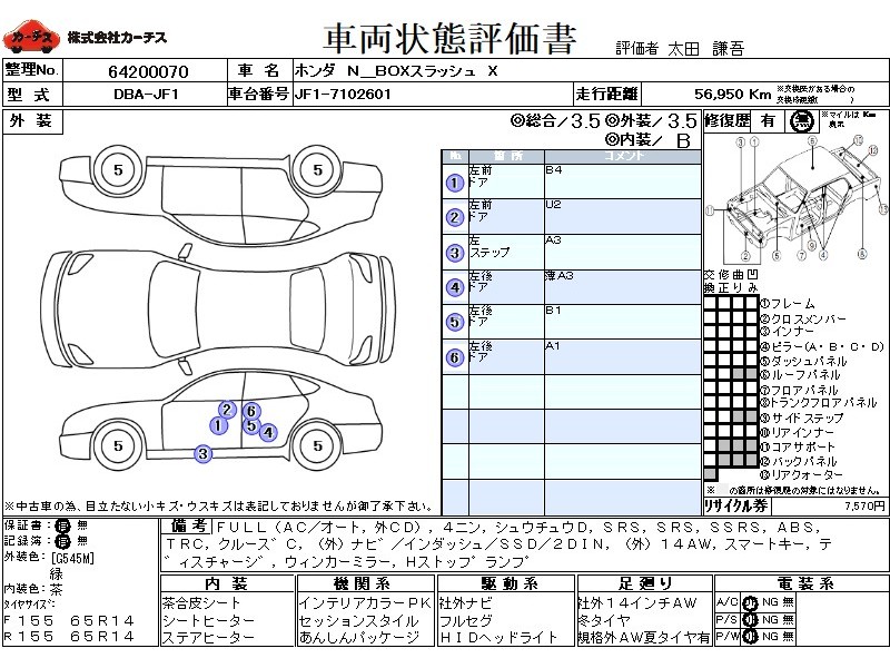 フル装備 / CD(社外) / 乗車定員(4人) / 集中ドアロック / エアバッグ / 助手席エアバッグ / サイドエアバッグ / ABS / トラクションコントロール / クルーズコントロール / カーナビゲーション(社外)(インダッシュ,SSD,2DIN) / 地デジTV(社外) / アルミホイール(社外)(14インチ) / スマートキー / ディスチャージ / ウインカーミラー / ハイマウントストップランプ /