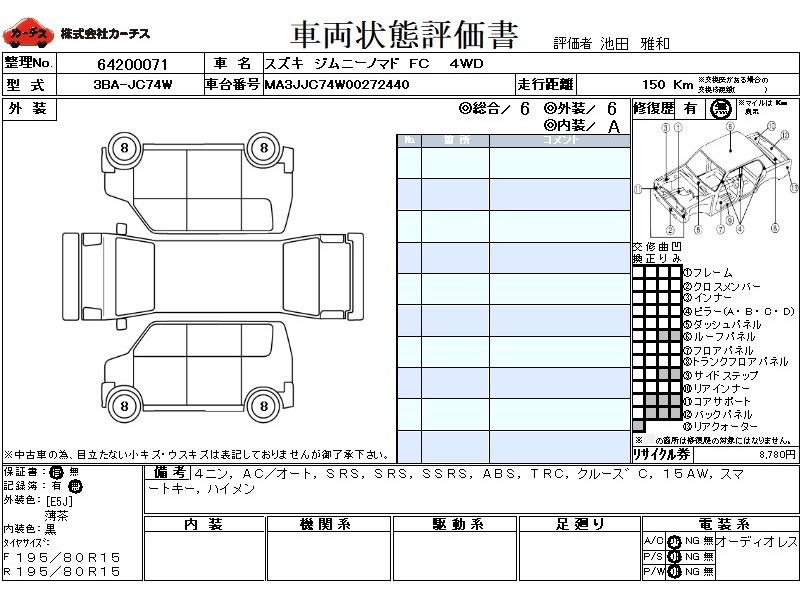 4ニン,AC/オート,PS,PW,SRS,PSSRS,SSRS,ABS,TRC,クルース゛C,15AW,スマートキー,ハイメン
