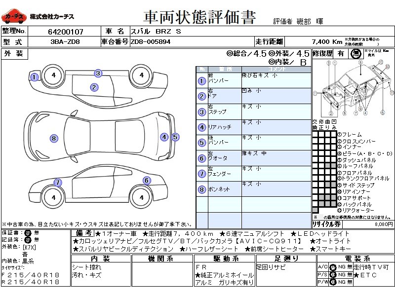 1オーナー車!走行距離7,400KM!6速マニュアルシフト!LEDヘッドライト!カロッツェリアナビ/フルセグTV/BT/バックカメラ!オートライト!スバルリヤビークルディテクション!ハーフレザーシート!前席シートヒーター!スマートキー!