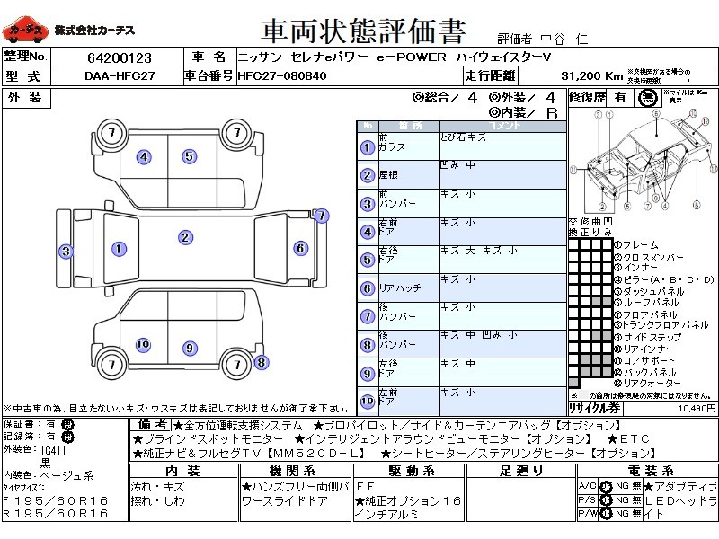フル装備 / CD / 乗車定員(7人) / 集中ドアロック / エアバッグ / 助手席エアバッグ / サイドエアバッグ / ABS / トラクションコントロール / クルーズコントロール / カーナビゲーション(インダッシュ,SSD,2DIN) / 地デジTV / バックカメラ(フロント) / ETC / アルミホイール(16インチ) / スマートキー / ウインカーミラー / ハイマウントストップランプ / パワースライドドア / フォグランプ /