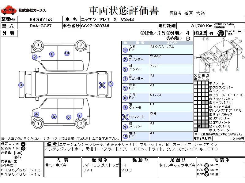 フル装備 / CD / 乗車定員(8人) / エアバッグ / 助手席エアバッグ / ABS / トラクションコントロール / クルーズコントロール / カーナビゲーション(インダッシュ,2DIN) / 地デジTV / バックカメラ / ETC / スマートキー / ウインカーミラー / パワースライドドア / フォグランプ / リアスポイラー /