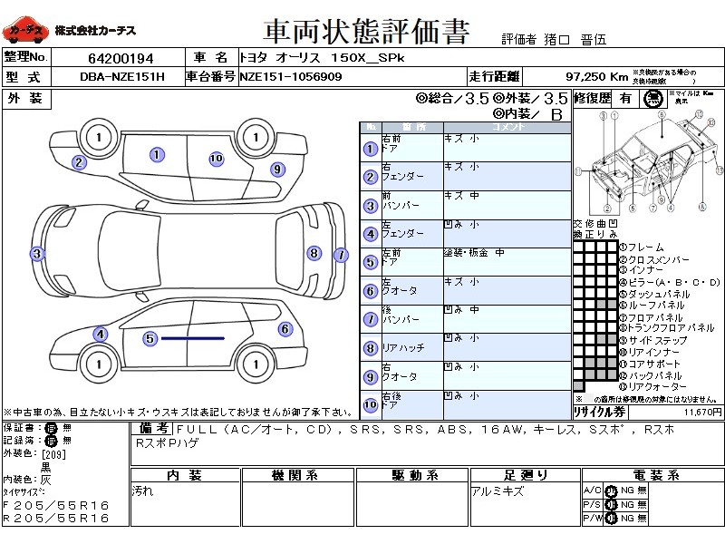FULL(AC/オート,CD),SRS,PSSRS,ABS,(外)Bカメラ,(外)ETC,16AW,キーレス,Sスホ゜,Rスホ゜