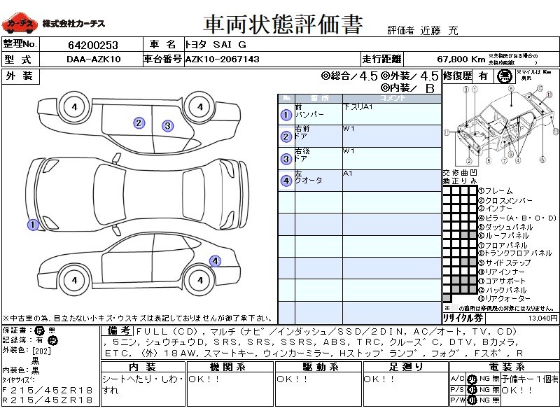 フル装備 / CD / マルチ(ナビ) / エアコン(オート) / テレビ(アナログ) / 乗車定員(5人) / 集中ドアロック / エアバッグ / 助手席エアバッグ / サイドエアバッグ / ABS / トラクションコントロール / クルーズコントロール / 地デジTV / バックカメラ / ETC / アルミホイール(社外)(18インチ) / スマートキー / ウインカーミラー / ハイマウントストップランプ / フォグランプ / フロントスポイラー / リアスポイラー /