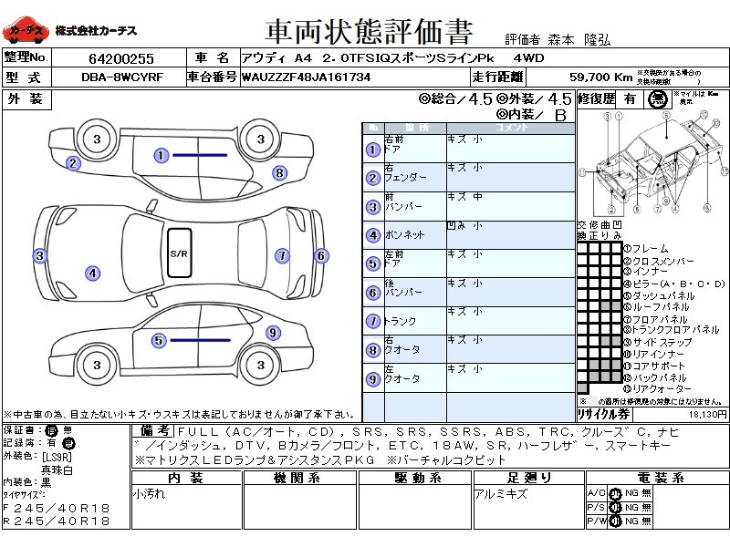 FULL(AC/オート,CD),SRS,PSSRS,SSRS,ABS,TRC,クルース゛C,ナヒ゛/インダッシュ,DTV,Bカメラ/フロント,ETC,18AW,SR,ハーフレサ゛ー,スマートキー