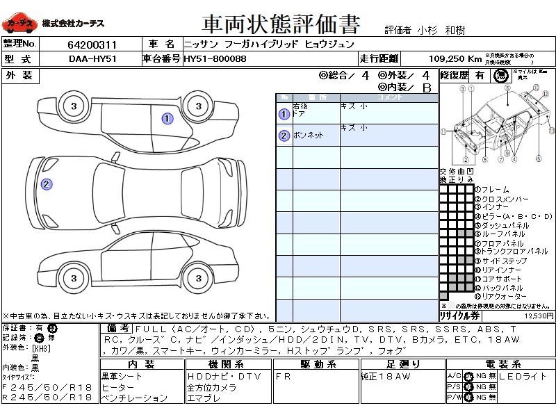 フル装備 / CD / 乗車定員(5人) / 集中ドアロック / エアバッグ / 助手席エアバッグ / サイドエアバッグ / ABS / トラクションコントロール / クルーズコントロール / カーナビゲーション(インダッシュ,HDD,2DIN) / テレビ(アナログ) / 地デジTV / バックカメラ / ETC / アルミホイール(18インチ) / 革シート(黒) / スマートキー / ウインカーミラー / ハイマウントストップランプ / フォグランプ /