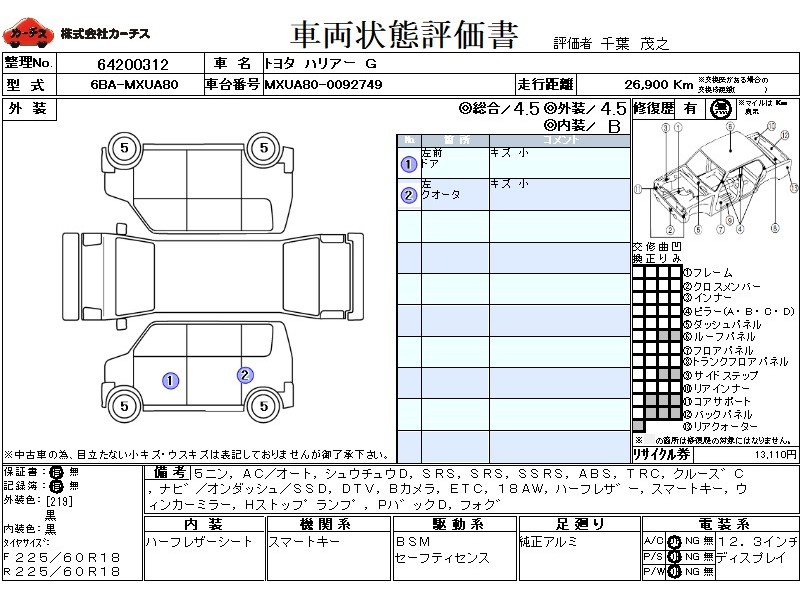 乗車定員(5人) / エアコン(オート) / パワーステアリング / パワーウィンドウ / 集中ドアロック / エアバッグ / 助手席エアバッグ / サイドエアバッグ / ABS / トラクションコントロール / クルーズコントロール / カーナビゲーション(オンダッシュ,SSD) / 地デジTV / バックカメラ / ETC / アルミホイール(18インチ) / ハーフレザーシート / スマートキー / ウインカーミラー / ハイマウントストップランプ / パワーバックドア / フォグランプ /