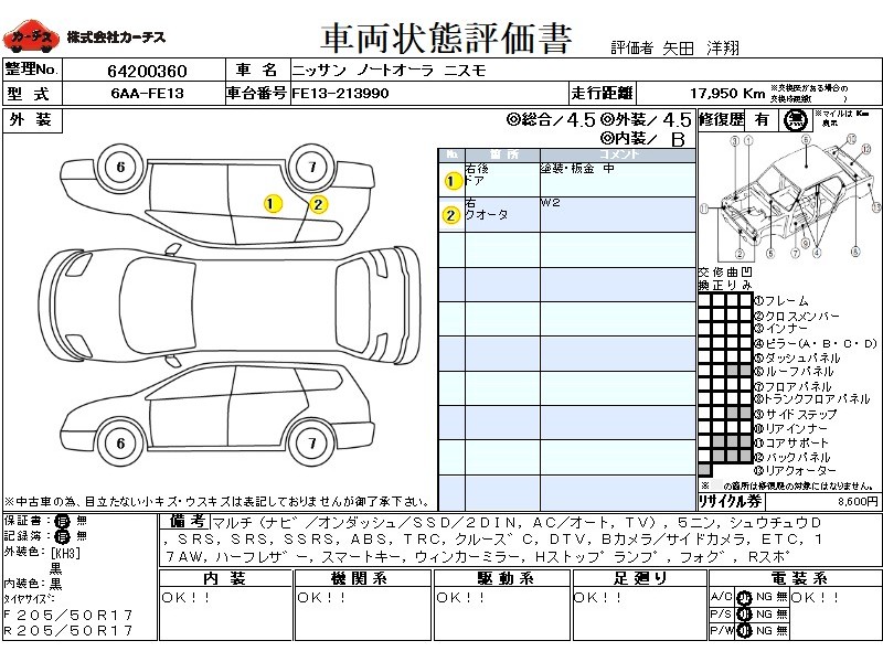 マルチ(ナビ) / エアコン(オート) / テレビ(アナログ) / 乗車定員(5人) / パワーステアリング / パワーウィンドウ / 集中ドアロック / エアバッグ / 助手席エアバッグ / サイドエアバッグ / ABS / トラクションコントロール / クルーズコントロール / 地デジTV / バックカメラ(サイドカメラ) / ETC / アルミホイール(17インチ) / ハーフレザーシート / スマートキー / ウインカーミラー / ハイマウントストップランプ / フォグランプ / リアスポイラー /