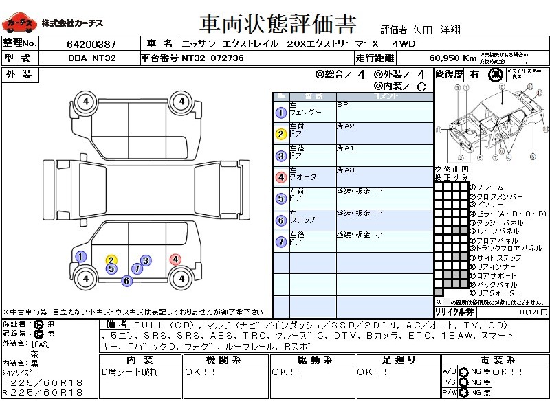 フル装備 / CD / マルチ(ナビ) / エアコン(オート) / テレビ(アナログ) / 乗車定員(5人) / エアバッグ / 助手席エアバッグ / ABS / トラクションコントロール / クルーズコントロール / 地デジTV / バックカメラ / ETC / アルミホイール(18インチ) / スマートキー / パワーバックドア / フォグランプ / ルーフレール / リアスポイラー /