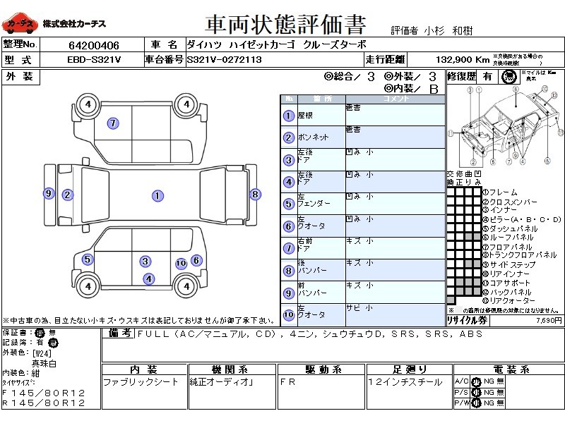フル装備 / CD / 乗車定員(4人) / 集中ドアロック / エアバッグ / 助手席エアバッグ / ABS / ETC(社外) /