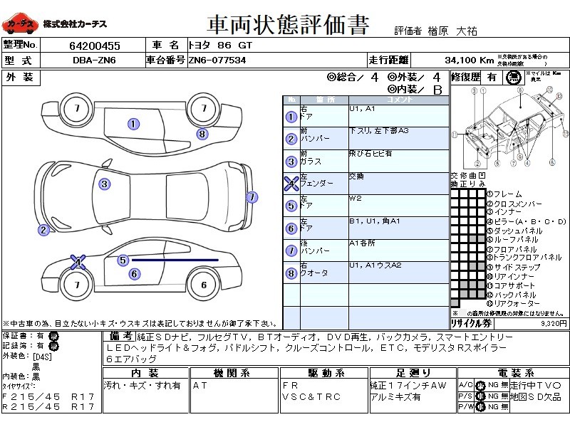 フル装備 / CD / 乗車定員(4人) / エアバッグ / 助手席エアバッグ / サイドエアバッグ / ABS / トラクションコントロール / クルーズコントロール / カーナビゲーション(インダッシュ,2DIN) / 地デジTV / バックカメラ / ETC / アルミホイール(17インチ) / スマートキー / フォグランプ / リアスポイラー /