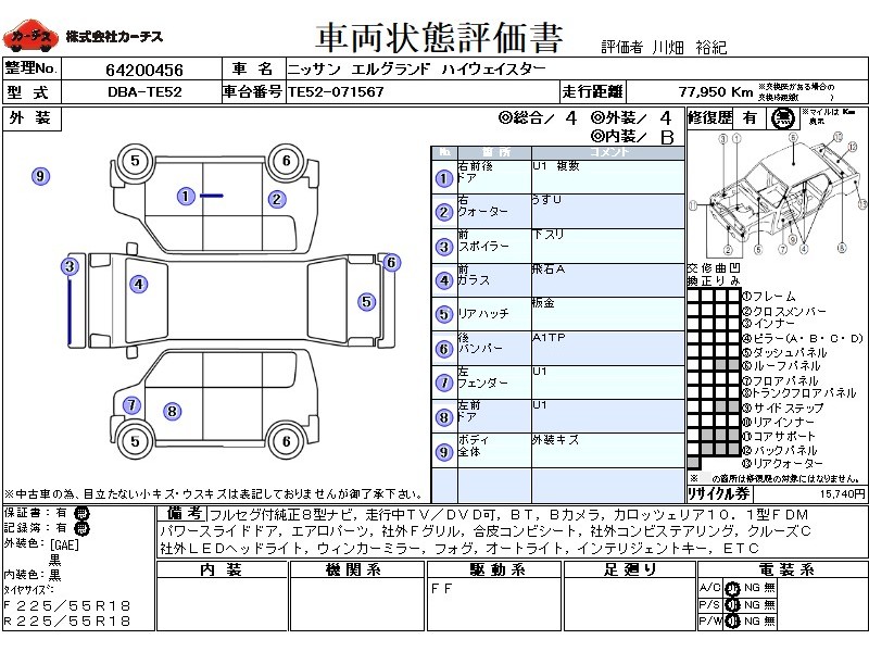 フル装備 / CD / 乗車定員(7人) / エアバッグ / 助手席エアバッグ / サイドエアバッグ / ABS / クルーズコントロール / カーナビゲーション(SSD) / テレビ(アナログ) / 地デジTV / バックカメラ / ETC / アルミホイール(18インチ) / スマートキー / ウインカーミラー / ハイマウントストップランプ / パワースライドドア / フォグランプ / フロントスポイラー(社外) / サイドスポイラー / リアスポイラー /