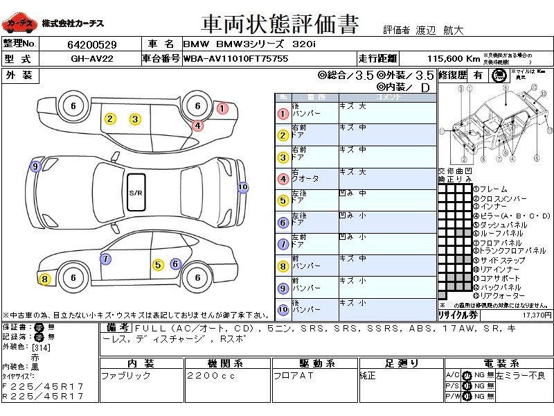 フル装備 / CD / 乗車定員(5人) / エアバッグ / 助手席エアバッグ / サイドエアバッグ / ABS / アルミホイール(17インチ) / サンルーフ / キーレスエントリー / ディスチャージ / リアスポイラー / マフラー(社外) /