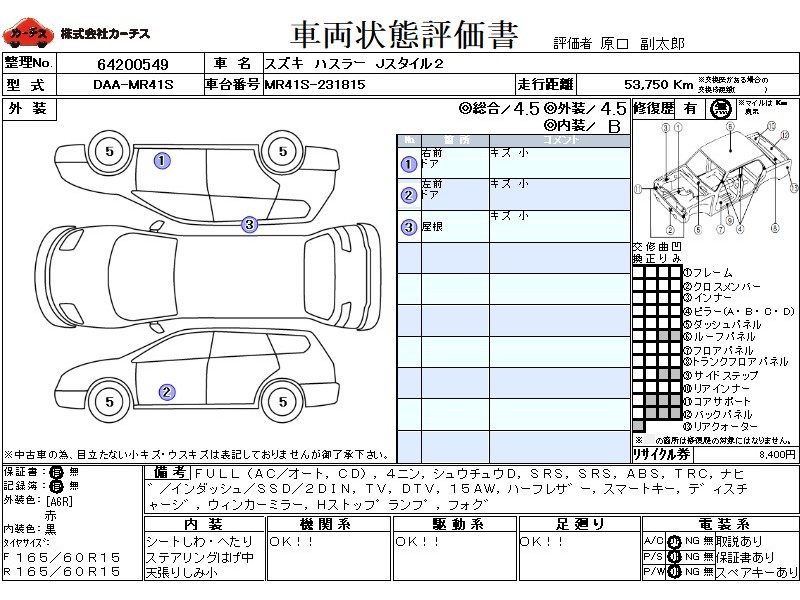 フル装備 / CD / 乗車定員(4人) / 集中ドアロック / エアバッグ / 助手席エアバッグ / ABS / トラクションコントロール / カーナビゲーション(インダッシュ,SSD,2DIN) / テレビ(アナログ) / 地デジTV / アルミホイール(15インチ) / ハーフレザーシート / スマートキー / ディスチャージ / ウインカーミラー / ハイマウントストップランプ / フォグランプ /