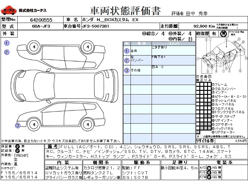 フル装備 / CD / 乗車定員(4人) / 集中ドアロック / エアバッグ / 助手席エアバッグ / サイドエアバッグ / ABS / トラクションコントロール / クルーズコントロール / カーナビゲーション(インダッシュ,SSD) / テレビ(アナログ) / 地デジTV / バックカメラ / ETC / アルミホイール(14インチ) / スマートキー / ウインカーミラー / ハイマウントストップランプ / パワースライドドア / フォグランプ / サイドスポイラー / リアスポイラー /