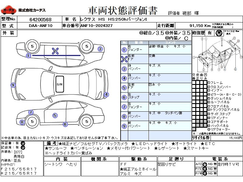 フル装備 / CD / MD / 乗車定員(5人) / 集中ドアロック / エアバッグ / 助手席エアバッグ / サイドエアバッグ / ABS / トラクションコントロール / カーナビゲーション(ポップアップ,HDD,2DIN) / 地デジTV / バックカメラ / ETC / アルミホイール(17インチ) / サンルーフ / 革シート(茶) / スマートキー / ウインカーミラー / ハイマウントストップランプ / フォグランプ /