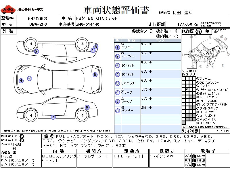フル装備 / CD(社外) / 乗車定員(4人) / 集中ドアロック / エアバッグ / 助手席エアバッグ / サイドエアバッグ / ABS / トラクションコントロール / カーナビゲーション(社外)(インダッシュ,SSD,2DIN) / テレビ(社外) / 地デジTV(社外) / アルミホイール(17インチ) / スマートキー / ディスチャージ / ハイマウントストップランプ / フォグランプ / リアスポイラー /