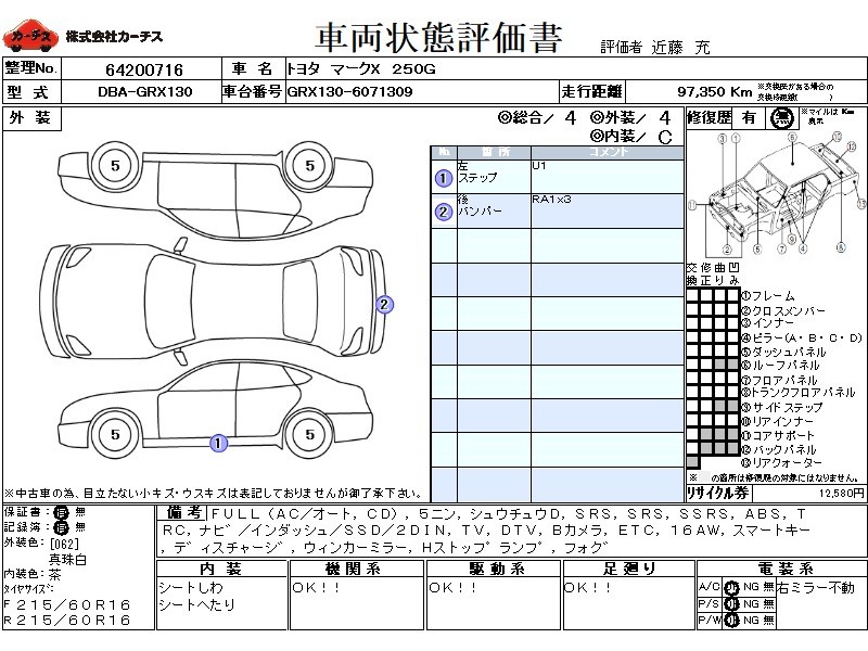 フル装備 / CD / 乗車定員(5人) / 集中ドアロック / エアバッグ / 助手席エアバッグ / サイドエアバッグ / ABS / トラクションコントロール / カーナビゲーション(インダッシュ,SSD,2DIN) / テレビ(アナログ) / 地デジTV / バックカメラ / ETC / アルミホイール(16インチ) / スマートキー / ディスチャージ / ウインカーミラー / ハイマウントストップランプ / フォグランプ /