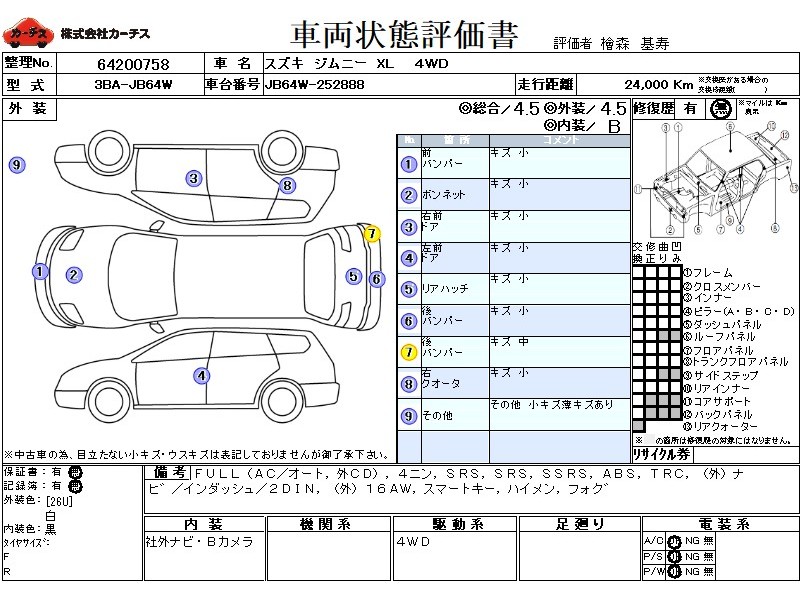 フル装備 / CD(社外) / 乗車定員(4人) / エアバッグ / 助手席エアバッグ / サイドエアバッグ / ABS / トラクションコントロール / カーナビゲーション(社外)(インダッシュ,2DIN) / アルミホイール(社外)(16インチ) / スマートキー / 背面タイヤ / フォグランプ /