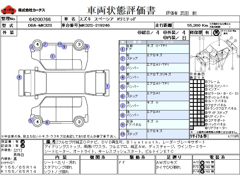 フル装備 / CD / 乗車定員(4人) / エアバッグ / 助手席エアバッグ / ABS / カーナビゲーション(SSD) / テレビ(アナログ) / 地デジTV / ETC / アルミホイール(14インチ) / スマートキー / ウインカーミラー / ハイマウントストップランプ / パワースライドドア / フォグランプ / フロントスポイラー / サイドスポイラー / リアスポイラー / リアアンダースポイラー /