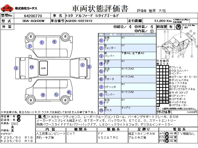 乗車定員(7人) / エアコン(オート) / パワーステアリング / パワーウィンドウ / エアバッグ / 助手席エアバッグ / サイドエアバッグ / ABS / トラクションコントロール / クルーズコントロール / カーナビゲーション(インダッシュ,2DIN) / バックカメラ / ETC / アルミホイール(18インチ) / ダブルサンルーフ / スマートキー / ウインカーミラー / パワースライドドア / フォグランプ / リアスポイラー /