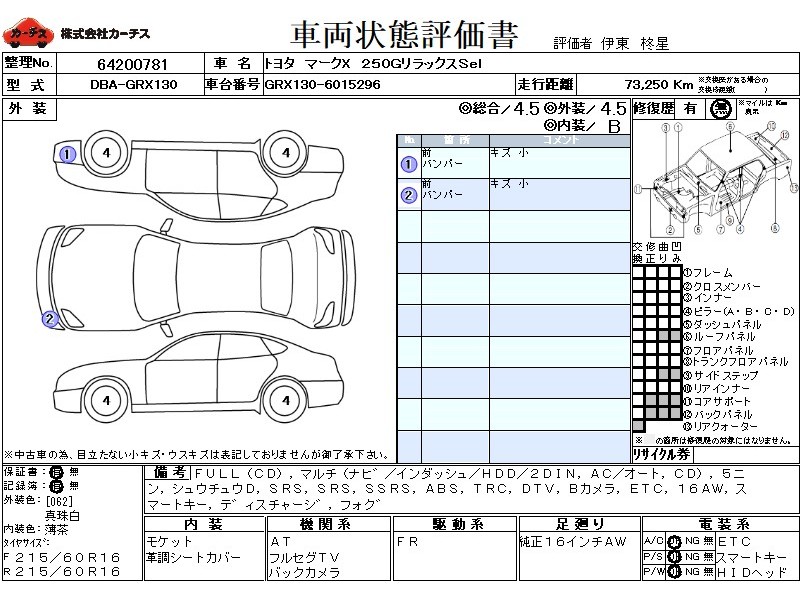 フル装備 / CD / マルチ(ナビ) / エアコン(オート) / 乗車定員(5人) / 集中ドアロック / エアバッグ / 助手席エアバッグ / サイドエアバッグ / ABS / トラクションコントロール / 地デジTV / バックカメラ / ETC / アルミホイール(16インチ) / スマートキー / ディスチャージ / フォグランプ /
