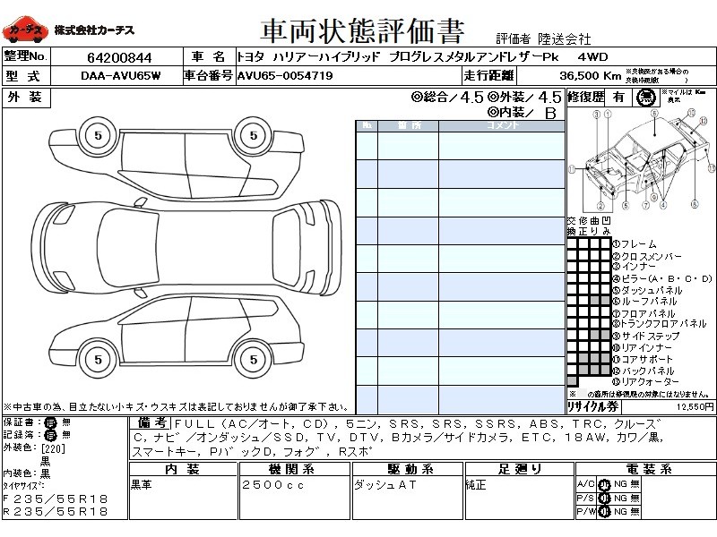 フル装備 / CD / 乗車定員(5人) / エアバッグ / 助手席エアバッグ / サイドエアバッグ / ABS / トラクションコントロール / クルーズコントロール / カーナビゲーション(オンダッシュ,SSD) / テレビ(アナログ) / 地デジTV / バックカメラ(サイドカメラ) / ETC / アルミホイール(18インチ) / 革シート(黒) / スマートキー / パワーバックドア / フォグランプ / リアスポイラー /