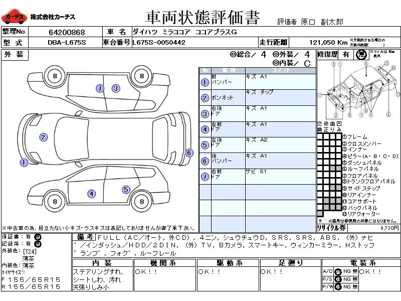 フル装備 / CD(社外) / 乗車定員(4人) / 集中ドアロック / エアバッグ / 助手席エアバッグ / ABS / カーナビゲーション(社外)(インダッシュ,HDD,2DIN) / テレビ(社外) / 地デジTV(社外) / バックカメラ / ETC(社外) / スマートキー / ウインカーミラー / ハイマウントストップランプ / フォグランプ / ルーフレール /