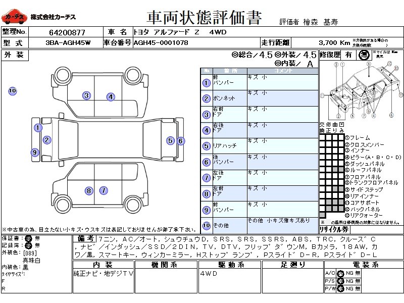 乗車定員(7人) / エアコン(オート) / パワーステアリング / パワーウィンドウ / 集中ドアロック / エアバッグ / 助手席エアバッグ / サイドエアバッグ / ABS / トラクションコントロール / クルーズコントロール / カーナビゲーション(インダッシュ,SSD,2DIN) / テレビ(アナログ) / 地デジTV / フリップダウンモニタ / バックカメラ / アルミホイール(18インチ) / 革シート(黒) / スマートキー / ウインカーミラー / ハイマウントストップランプ / パワースライドドア / パワーバックドア / フォグランプ /
