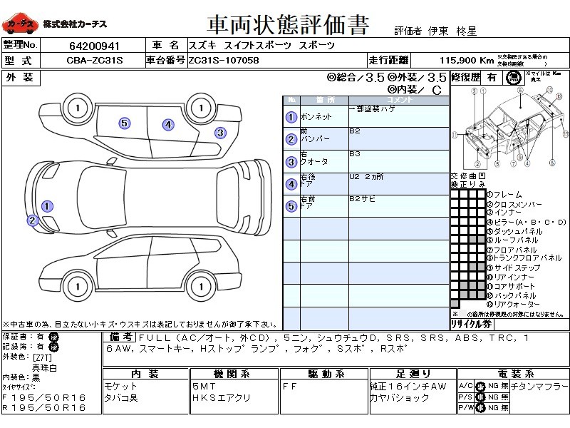 フル装備 / CD(社外) / 乗車定員(5人) / 集中ドアロック / エアバッグ / 助手席エアバッグ / ABS / トラクションコントロール / ETC(社外) / アルミホイール(16インチ) / スマートキー / ハイマウントストップランプ / フォグランプ / サイドスポイラー / リアスポイラー / マフラー(社外) / 足回り /
