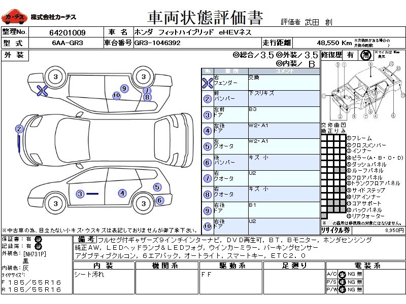 フル装備 / CD / 乗車定員(5人) / エアバッグ / 助手席エアバッグ / サイドエアバッグ / ABS / トラクションコントロール / クルーズコントロール / カーナビゲーション(SSD) / テレビ(アナログ) / 地デジTV / ETC / アルミホイール(16インチ) / スマートキー / ウインカーミラー / ハイマウントストップランプ / フォグランプ /
