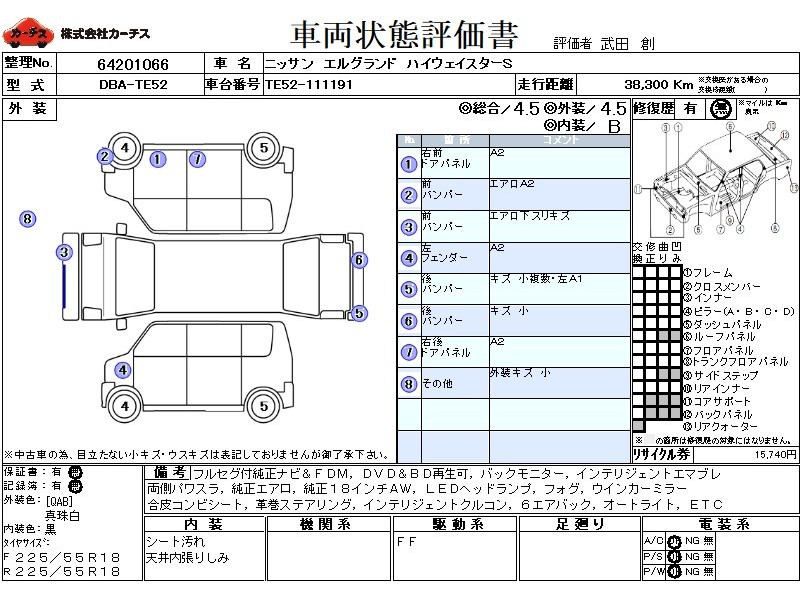フル装備 / CD / 乗車定員(7人) / エアバッグ / 助手席エアバッグ / サイドエアバッグ / ABS / トラクションコントロール / クルーズコントロール / カーナビゲーション(SSD) / テレビ(アナログ) / 地デジTV / フリップダウンモニタ / バックカメラ / ETC / アルミホイール(18インチ) / スマートキー / ウインカーミラー / ハイマウントストップランプ / パワースライドドア / フォグランプ / フロントスポイラー / サイドスポイラー / リアスポイラー /