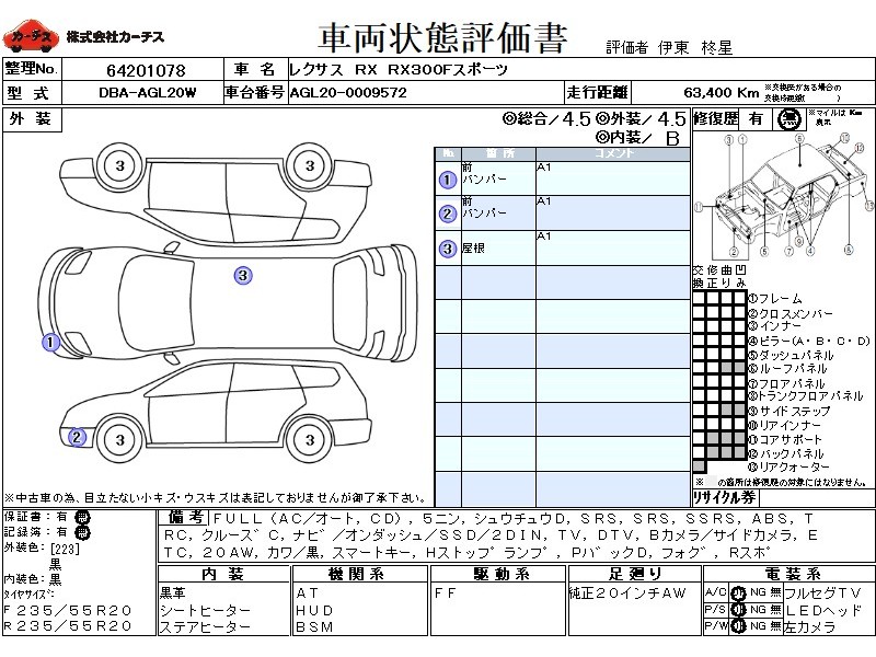 フル装備 / CD / 乗車定員(5人) / 集中ドアロック / エアバッグ / 助手席エアバッグ / サイドエアバッグ / ABS / トラクションコントロール / クルーズコントロール / カーナビゲーション(オンダッシュ,SSD,2DIN) / テレビ(アナログ) / 地デジTV / バックカメラ(サイドカメラ) / ETC / アルミホイール(20インチ) / 革シート(黒) / スマートキー / ハイマウントストップランプ / パワーバックドア / フォグランプ / リアスポイラー /