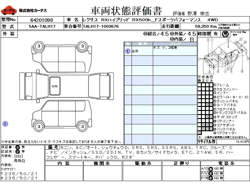 乗車定員(5人) / エアコン(オート) / パワーステアリング / パワーウィンドウ / 集中ドアロック / エアバッグ / 助手席エアバッグ / サイドエアバッグ / ABS / トラクションコントロール / クルーズコントロール / カーナビゲーション(インダッシュ,SSD,2DIN) / テレビ(アナログ) / バックカメラ(サイドカメラ) / ETC / アルミホイール(21インチ) / サンルーフ / ハーフレザーシート / スマートキー / パワーバックドア / リアスポイラー /