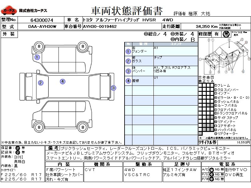 プリクラッシュセーフティ レーダークルーズコントロール パノラミックビューモニター インテリジェントクリアランスソナー メーカーナビ&JBLプレミアムサウンドシステム フリップダウンモニター フルセグTV BTオーディオ DVD再生 ナビ連動DSRC スマートエントリー 両側パワースライドドア&パワーバックドア LEDヘッドライト&フォグランプ 純正17インチアルミ 禁煙車