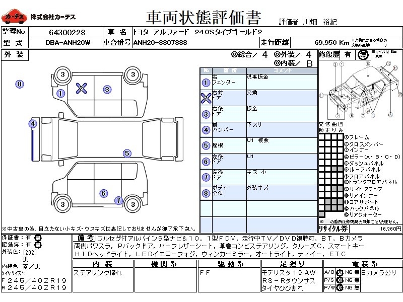 フル装備 / CD(社外) / 乗車定員(7人) / エアバッグ / 助手席エアバッグ / サイドエアバッグ / ABS / クルーズコントロール / カーナビゲーション(社外)(SSD) / テレビ(社外) / 地デジTV(社外) / ETC(社外) / アルミホイール(社外)(19インチ) / ハーフレザーシート / スマートキー / ディスチャージ / ウインカーミラー / ハイマウントストップランプ / パワースライドドア / パワーバックドア / フォグランプ / サイドスポイラー / リアスポイラー / 足回り /