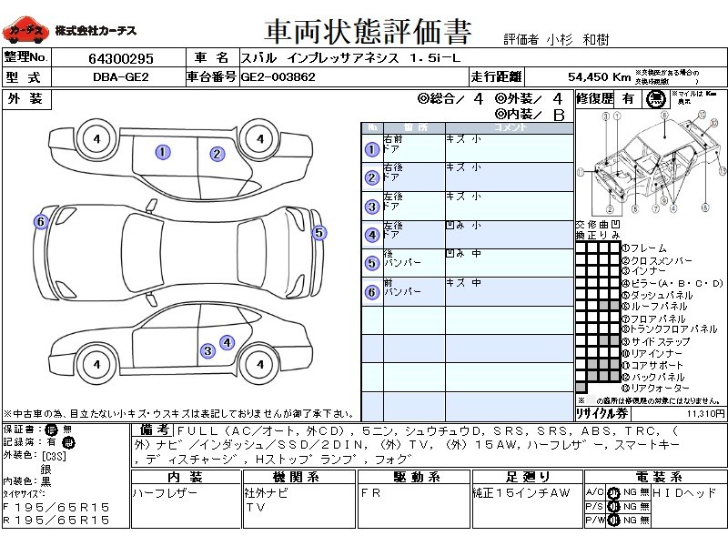 フル装備 / CD(社外) / 乗車定員(5人) / 集中ドアロック / エアバッグ / 助手席エアバッグ / ABS / トラクションコントロール / カーナビゲーション(社外)(インダッシュ,SSD,2DIN) / テレビ(社外) / 地デジTV(社外) / ETC(社外) / アルミホイール(社外)(15インチ) / ハーフレザーシート / スマートキー / ディスチャージ / ハイマウントストップランプ / フォグランプ /