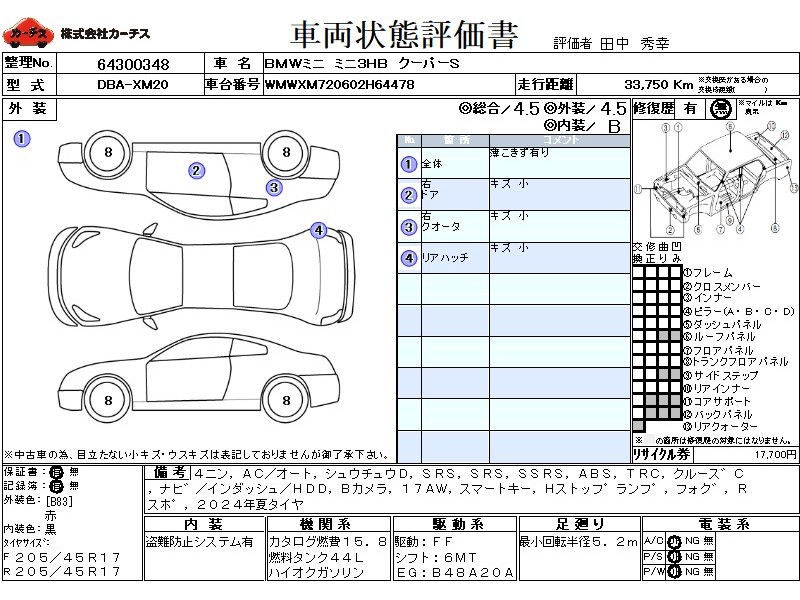 乗車定員(4人) / エアコン(オート) / パワーステアリング / パワーウィンドウ / 集中ドアロック / エアバッグ / 助手席エアバッグ / サイドエアバッグ / ABS / トラクションコントロール / クルーズコントロール / カーナビゲーション(インダッシュ,HDD) / バックカメラ / アルミホイール(17インチ) / スマートキー / ハイマウントストップランプ / フォグランプ / リアスポイラー /