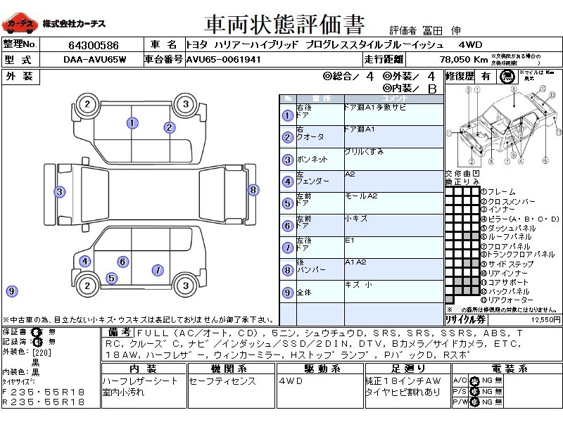 フル装備 / CD / 乗車定員(5人) / 集中ドアロック / エアバッグ / 助手席エアバッグ / サイドエアバッグ / ABS / トラクションコントロール / クルーズコントロール / カーナビゲーション(インダッシュ,SSD,2DIN) / 地デジTV / バックカメラ(サイドカメラ) / ETC / アルミホイール(18インチ) / ハーフレザーシート / ウインカーミラー / ハイマウントストップランプ / パワーバックドア / リアスポイラー /