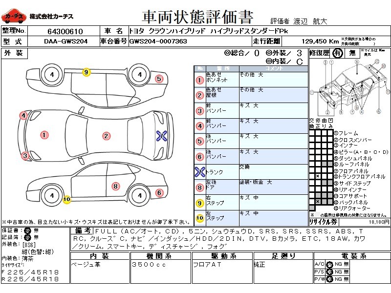フル装備 / CD / 乗車定員(5人) / 集中ドアロック / エアバッグ / 助手席エアバッグ / サイドエアバッグ / ABS / トラクションコントロール / クルーズコントロール / カーナビゲーション(インダッシュ,HDD,2DIN) / 地デジTV / バックカメラ / ETC / アルミホイール(18インチ) / 革シート(クリーム) / スマートキー / ディスチャージ / フォグランプ / フロントスポイラー(社外) / サイドスポイラー(社外) / リアアンダースポイラー(社外) /