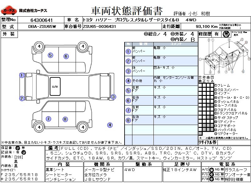 フル装備 / CD / マルチ(ナビ) / エアコン(オート) / テレビ(アナログ) / 乗車定員(5人) / 集中ドアロック / エアバッグ / 助手席エアバッグ / サイドエアバッグ / ABS / トラクションコントロール / クルーズコントロール / 地デジTV / バックカメラ(サイドカメラ) / ETC / アルミホイール(18インチ) / サンルーフ / 革シート(黒) / スマートキー / ウインカーミラー / ハイマウントストップランプ / パワーバックドア / フォグランプ / リアスポイラー /