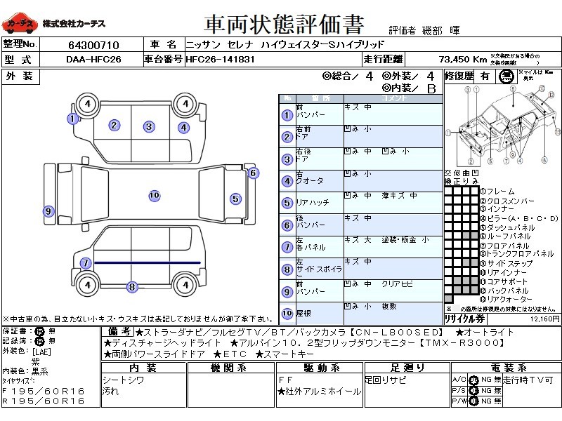 フル装備 / CD(社外) / 乗車定員(8人) / エアバッグ / 助手席エアバッグ / ABS / トラクションコントロール / クルーズコントロール / カーナビゲーション(社外)(インダッシュ,HDD,2DIN) / 地デジTV(社外) / ETC(社外) / アルミホイール(社外)(16インチ) / スマートキー / ディスチャージ / ウインカーミラー / ハイマウントストップランプ / パワースライドドア / サイドスポイラー / リアスポイラー /