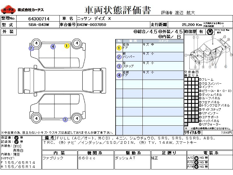 フル装備 / CD(社外) / 乗車定員(4人) / 集中ドアロック / エアバッグ / 助手席エアバッグ / サイドエアバッグ / ABS / トラクションコントロール / カーナビゲーション(社外)(インダッシュ,SSD,2DIN) / テレビ(社外) / ETC(社外) / アルミホイール(14インチ) / スマートキー /