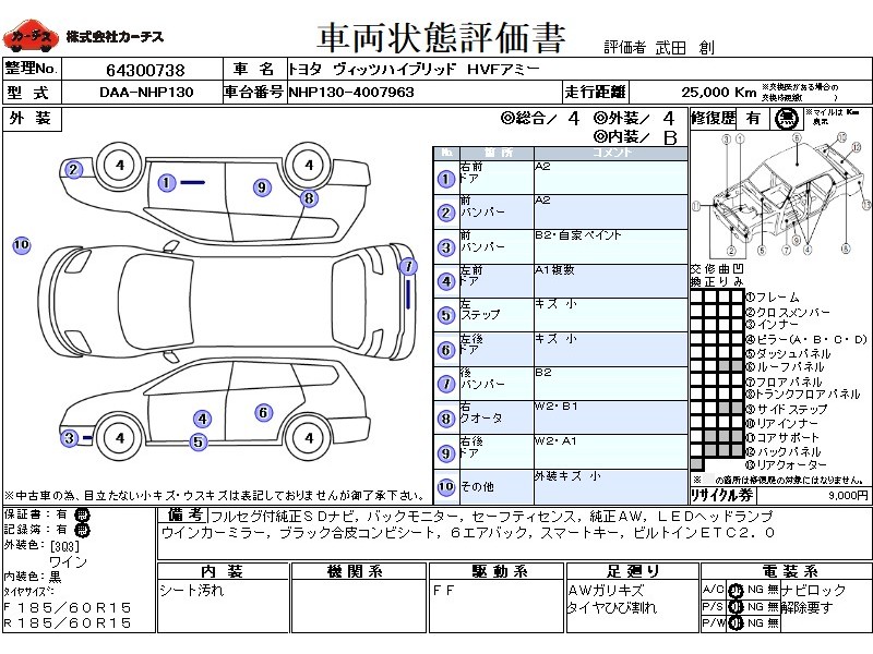 フル装備 / CD / 乗車定員(5人) / エアバッグ / 助手席エアバッグ / サイドエアバッグ / ABS / トラクションコントロール / カーナビゲーション(SSD) / テレビ(アナログ) / 地デジTV / バックカメラ / ETC / アルミホイール(15インチ) / スマートキー / ウインカーミラー / ハイマウントストップランプ / フォグランプ /