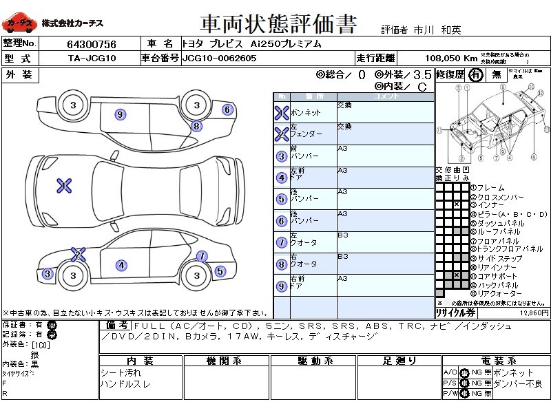 フル装備 / CD / 乗車定員(5人) / エアバッグ / 助手席エアバッグ / ABS / トラクションコントロール / カーナビゲーション(インダッシュ,DVD,2DIN) / バックカメラ / アルミホイール(17インチ) / キーレスエントリー / ディスチャージ /