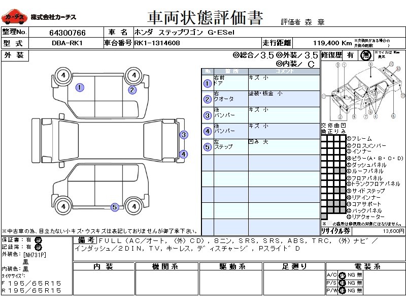フル装備 / CD(社外) / 乗車定員(8人) / エアバッグ / 助手席エアバッグ / ABS / トラクションコントロール / カーナビゲーション(社外)(インダッシュ,2DIN) / テレビ(アナログ) / ETC(社外) / キーレスエントリー / ディスチャージ / パワースライドドア /